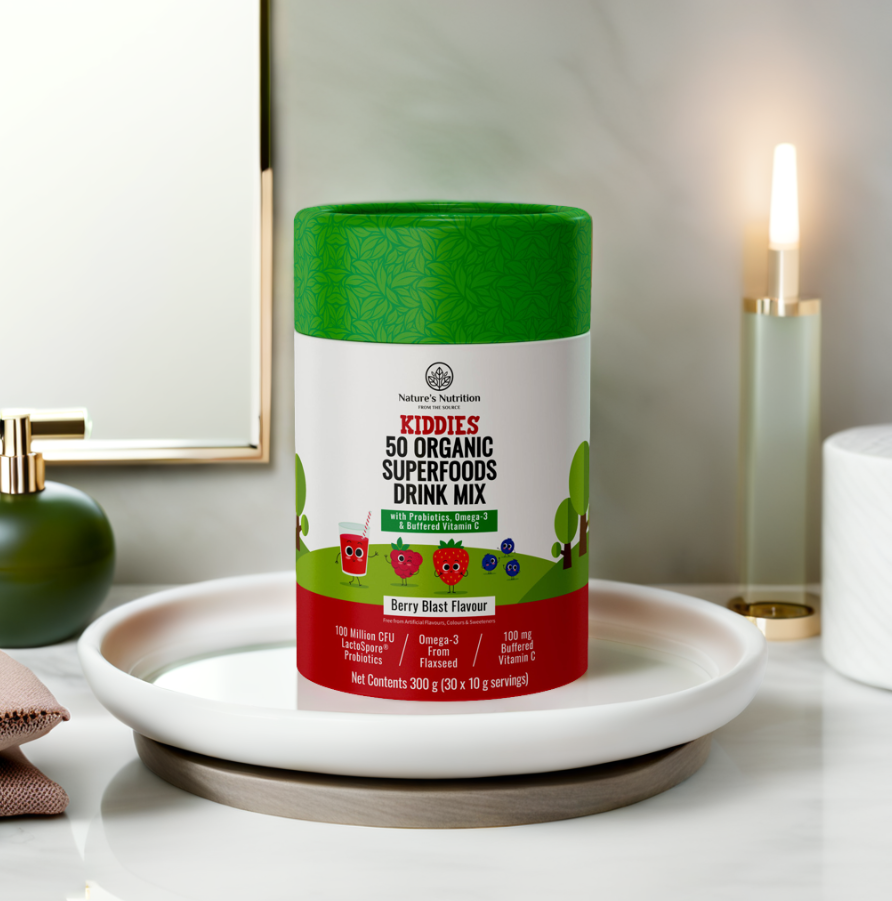 The Kiddies Amazing Superfood Mix – Berry Blast from Nature’s Nutrition is specially formulated for children (and fussy eaters too)! 50 fruits and veggies, with added omegas and dairy-free probiotics, give growing bodies the vital nutrients they need to support their healthy growth and development. Mix the Kiddies Amazing Superfood Mix into their fruit juice or porridge to give them a head start!